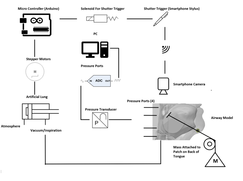 I made this anatomical phantom as part of my masters work at UNLV. The goal was to asses the effectiveness of a novel treatment for sleep apnea and validate force and pressure values computed numerically with computer simulations. The diagram shows the experimental design used to collect this data from the physical model.